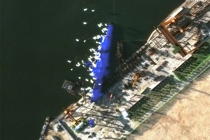 Yeni peyk görüntüləri Şimali Koreyanın yan tərəfində olan və qismən su altında qalan 5 min ton ağırlığında zədələnmiş döyüş gəmisinin ətrafına şara bənzər obyektlər yerləşdirdiyini ortaya çıxarıb.